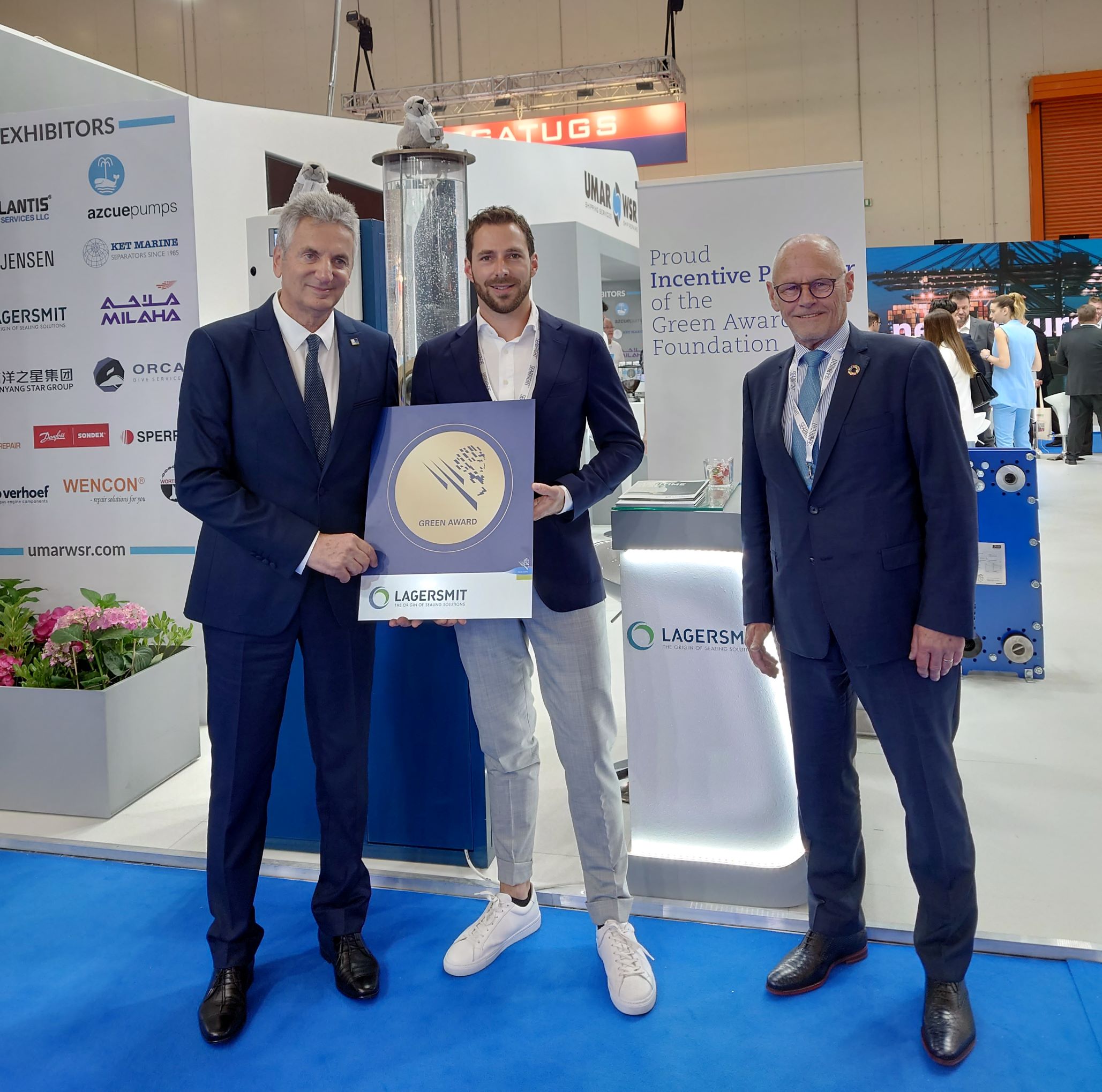 Tijdens de Posidonia-beurs in Athene ontving Lagersmits Sales Manager Jan Willem Bongers de symbolische Green Award-plaquette uit handen van Dimitris Mattheou (l) en Jan Fransen (r), voorzitter resp. Executive Director van de Green Award Foundation. Hiermee is de deelname van Lagersmit aan het Green Award netwerk van partijen die de verduurzaming van de scheepvaart stimuleren bekrachtigd.