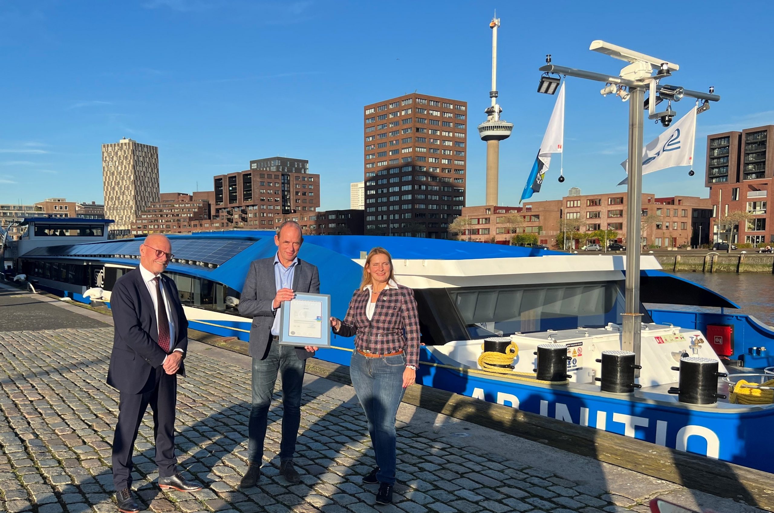 Green Award voor de binnenvaart groeit door en heeft een nieuwe mijlpaal bereikt: 1.100 gecertificeerde binnenvaartschepen. En nummer 1.100 is niet zomaar een schip: het is de Ab Initio, het innovatieve opleidingsschip van STC Group. Tijdens een feestelijke ceremonie op 12 november, de Dag van Binnenvaart, overhandigde gedeputeerde mevrouw Jeannette Baljeu het Green Award certificaat op het niveau ‘goud’ aan Frits Gronsveld van het College van Bestuur van STC Group.
