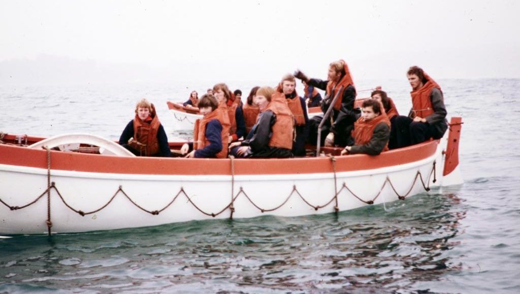 Jan Fransen (center, seated) during lifeboat training from a trading vessel off the UK South Coast. © Green Award Foundation